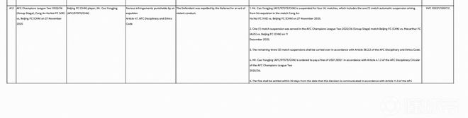 剩余3場停賽將根據《亞足聯紀律與道德準則》第38.2.3條予以延續執行。由于下賽季國安已經獲得亞冠精英聯賽附加賽的資格,如果能順利打進正賽,曹永競可能不得不在前3場比賽中都無法登場。