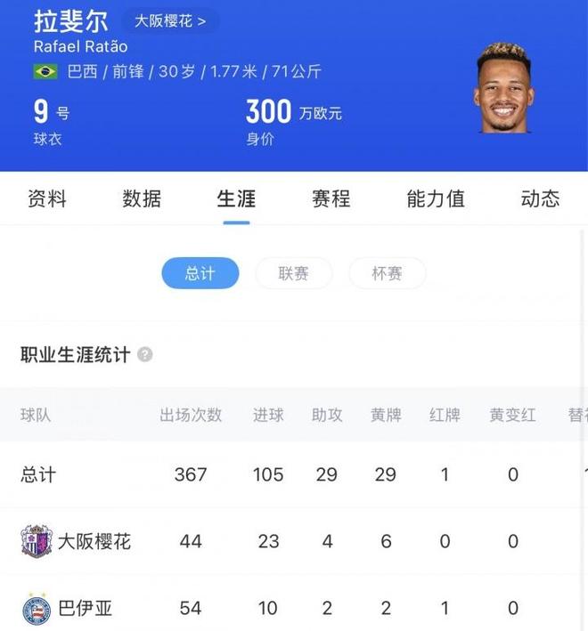 今年,巴西前鋒拉唐在J聯賽刷出亮眼成績單,租借到大阪櫻花期間44場比賽打進23球,外加4次助攻,場均進球數過0.5球。論身體條件,拉唐并不算出色——30歲的他踢9號位,身高1.77米,71公斤顯得略微瘦弱。這身體條件去歐洲踢球可能牽強,但混J聯賽綽綽有余,就算來到中超,也不算差。在巴伊亞時,拉唐的數據不算太好,出場54次打進10球,這進球效率并不高。也可能是拉唐的身體條件+技術能力更適合混東亞聯賽吧。