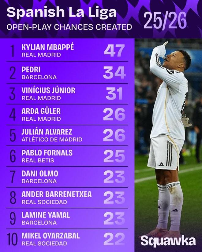 根據統計,本賽季到目前為止,姆巴佩是西甲當中運動戰創造機會最多的球員,佩德里位居第二,維尼修斯位居第三。